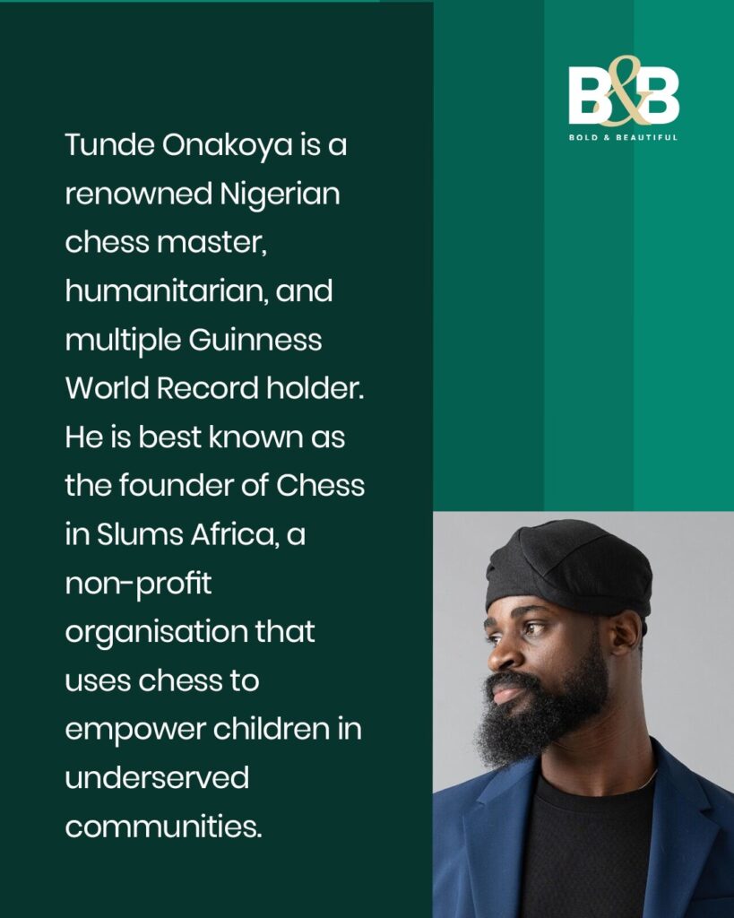 Tunde Onakoya is a renowned Nigerian chess master, humanitarian, and multiple Guinness World Record holder. He is best known as the founder of Chess in Slums Africa, a non-profit organisation that uses chess to empower children in underserved communities.