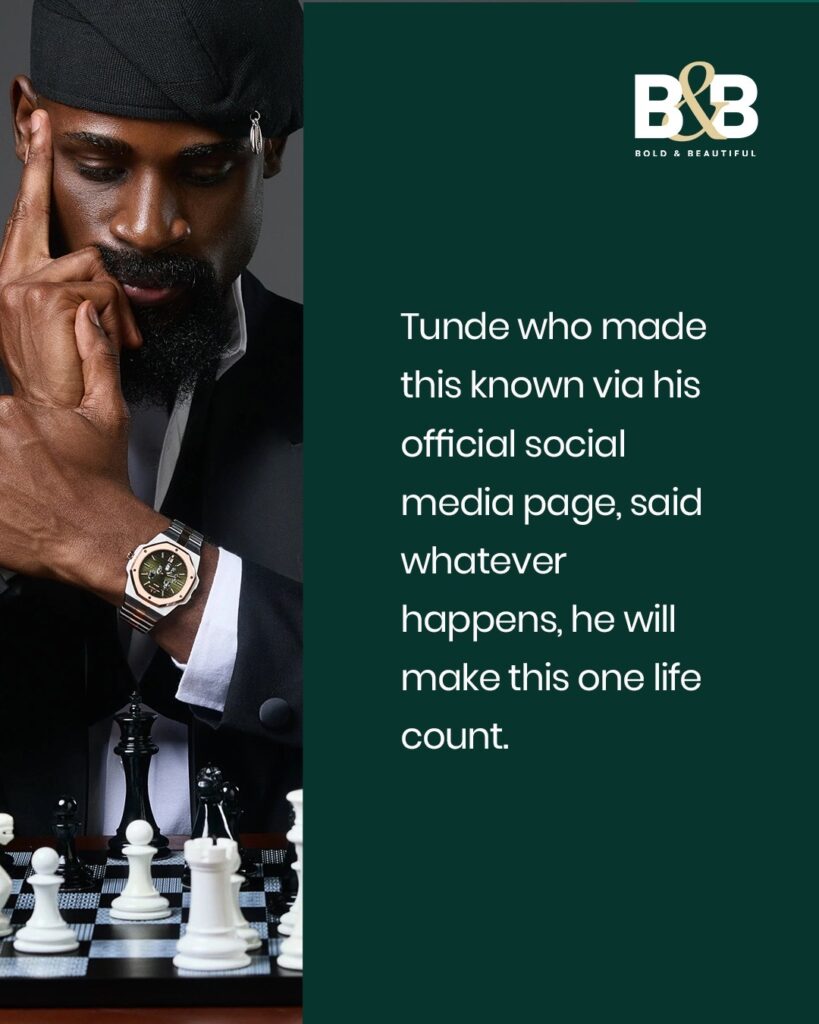 Tunde who made this known via his official social media page, said whatever happens, he will make this one life count.